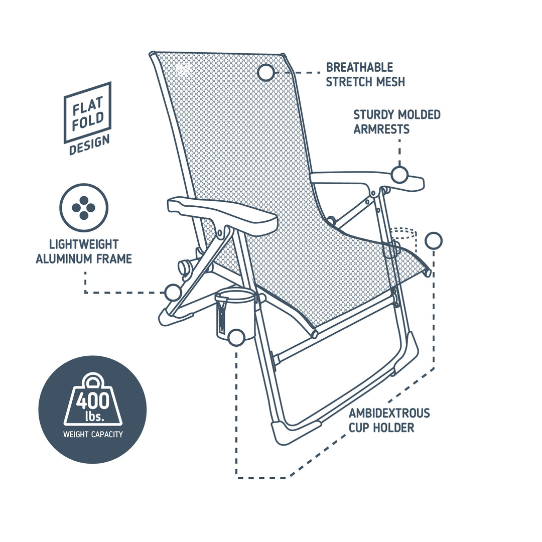 Breathable stretch mesh, a lightweight aluminum frame with a 400-lb capacity, and a flat-folding design deliver all-day comfort wherever you Outdoor Your Way™.